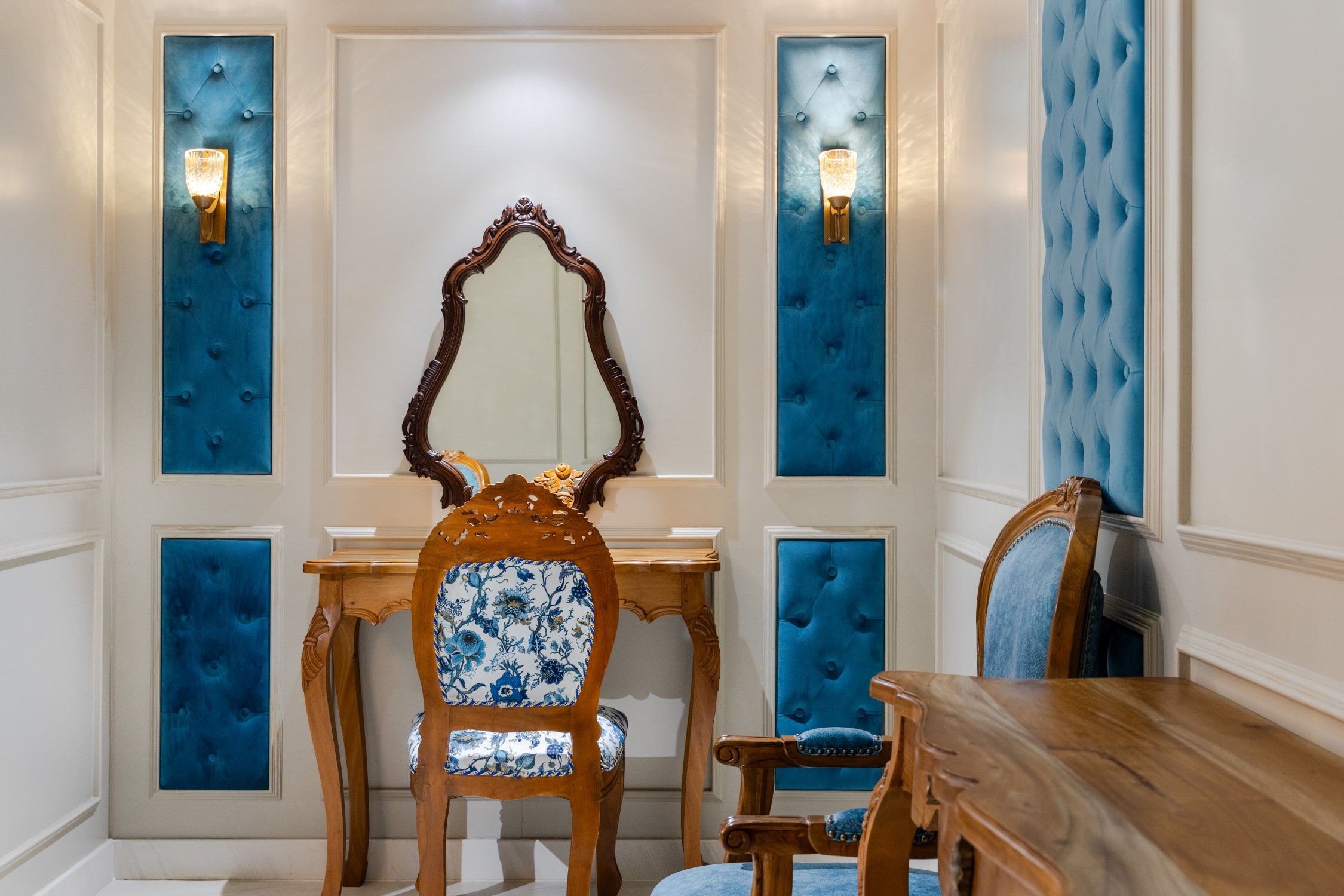 As one walks through the doors, is welcomed by center piece display which triggers awe experience of the buyer. The buyer then sees picks from 2 lounges. The first, an ornate blue hued Victorian classic while the other is a contemporary styled pink lounge. This opposite setting dramatically changes the buyer’s experience of chosen piece of jewelry, a deliberate design decision.